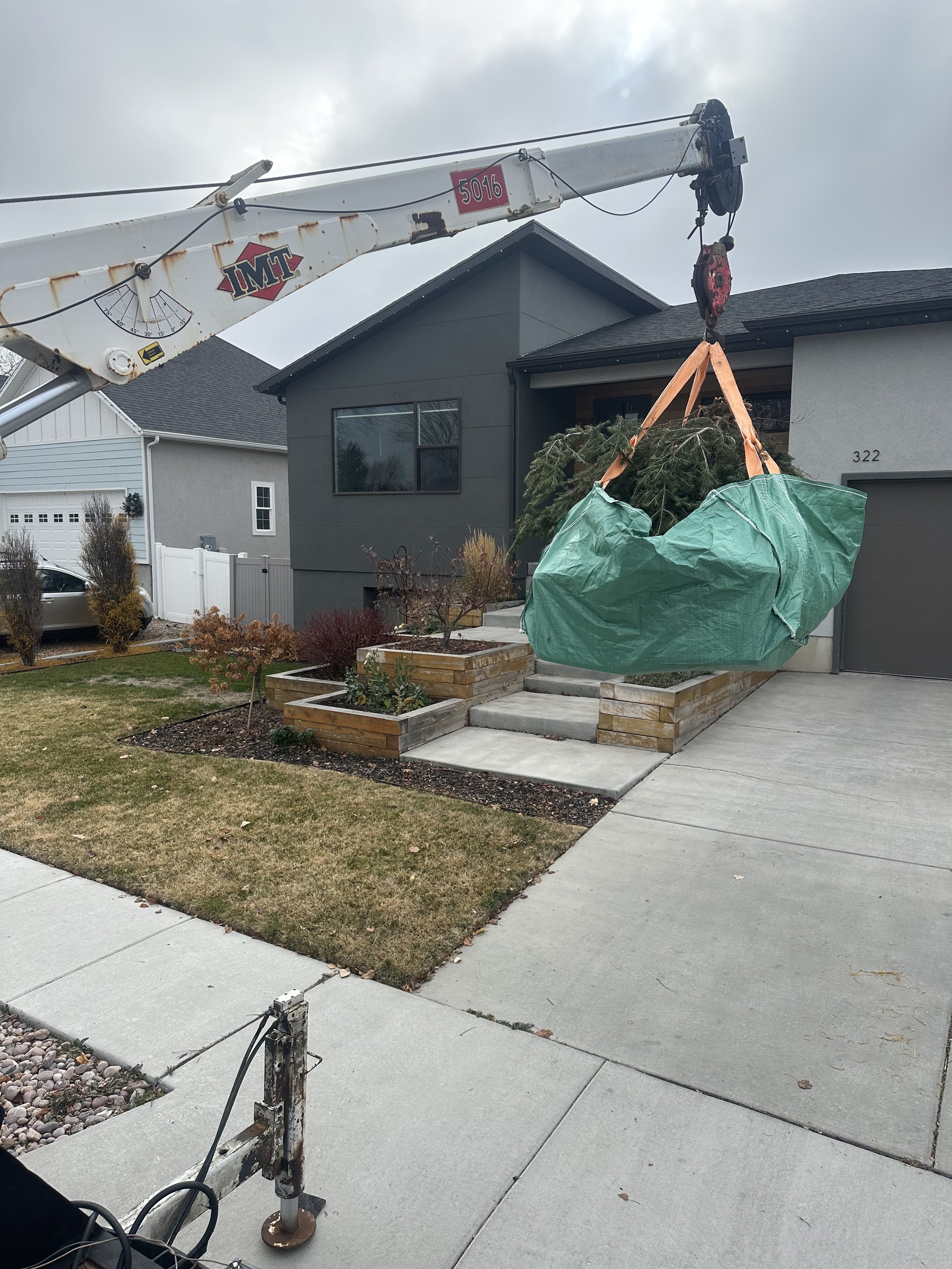 A crane lifting a large Christmas tree wrapped in green netting in the front yard of a modern house with a gray exterior and concrete steps.